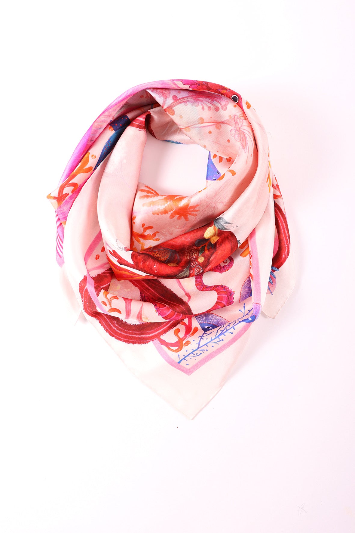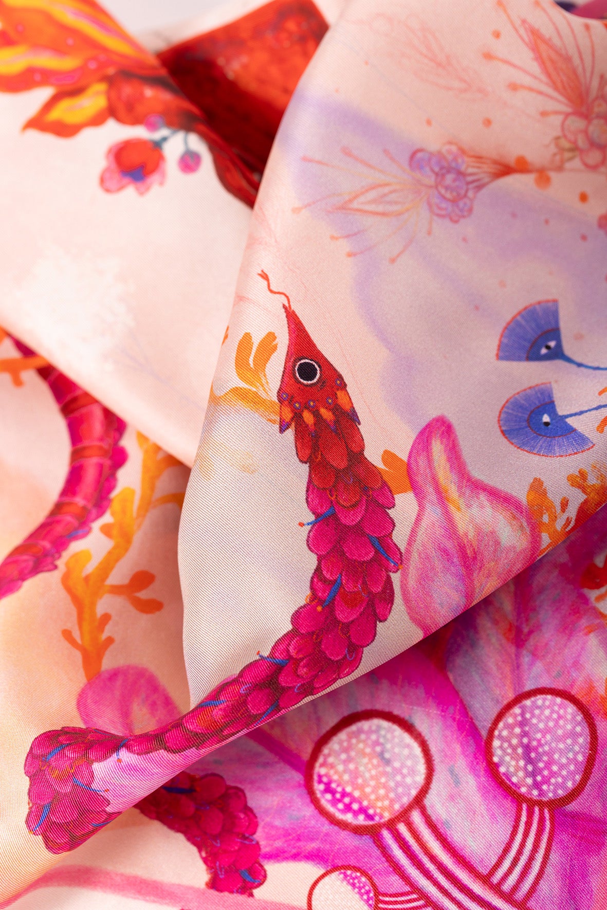 Bu özel tasarım fular; cildinize ve doğaya saygılı, OEKO-TEX sertifikalı İtalyan boyalarla, yüksek kaliteli dijital baskı yöntemi kullanılarak renklendirilmiştir. Kanserojen madde içermeyen bu boyalar, renklerin uzun yıllar canlılığını korumasını sağlarken ipeğin doğal yapısını ve nefes alabilirliğini muhafaza eder.